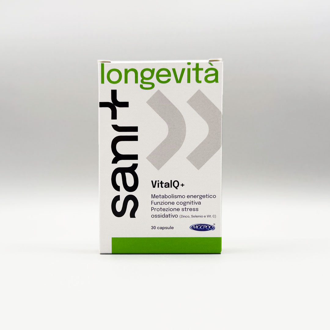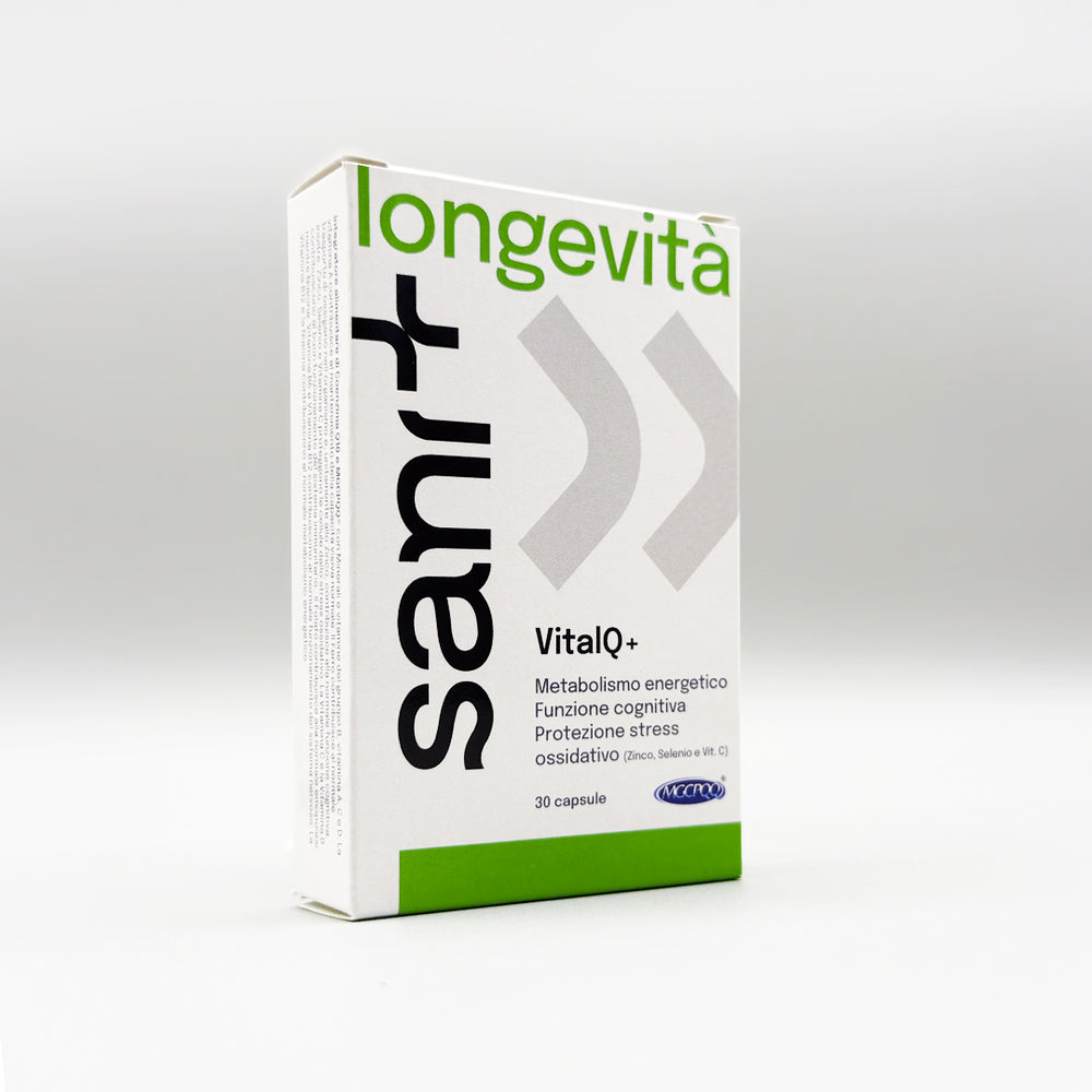 VitalQ+ è studiato per sostenere la produzione di energia a livello cellulare , migliorare la resistenza fisica e mentale e agire come un potente anti-aging. Un potente mix di Coenzima Q10, MGCPQQ®, Zinco Pidolato Pido-Zinc® e un insieme di vitamine del gruppo B, C, D, ferro, selenio e zinco.