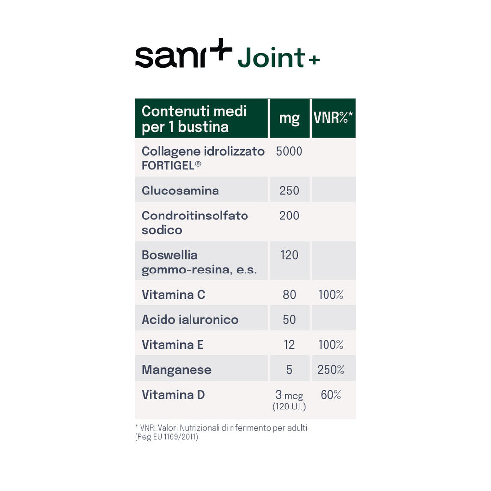 Joint Plus è un integratore in bustine monodose di polvere solubile, specificamente formulato per il benessere delle articolazioni, il sostegno delle cartilagini, la riduzione dell’infiammazione e il miglioramento della mobilità quotidiana. Grazie alla presenza di molecole brevettate come i peptidi bioattivi di collagene Fortigel® 5.000mg, acido ialuronico e Boswellia AKBAMAX®, Joint Plus offre un'azione mirata ed efficace per il benessere articolare.